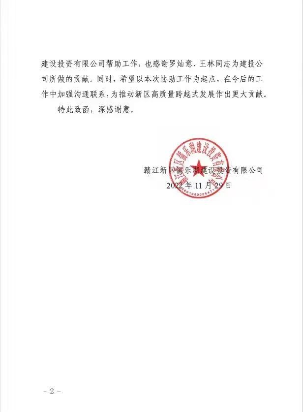 近日,同濟建管收到贛江新區(qū)儒樂湖建設(shè)投資有限公司的感謝函,感謝同濟建管外派到該公司幫忙的兩名員工羅燦意和王林,在儒樂湖建設(shè)項目推進過程中發(fā)揮的積極作用和作出的貢獻,并希望以此次協(xié)助工作為起點,雙方加強溝通聯(lián)系,為推動贛江新區(qū)高質(zhì)量跨越式發(fā)展作出更大貢獻。