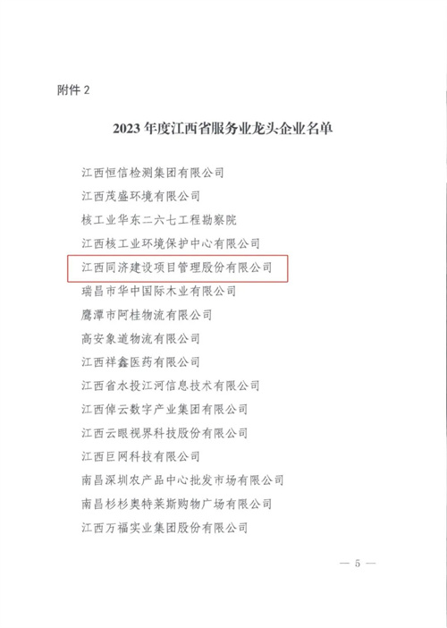 近日,江西省發(fā)展改革委員會發(fā)布了《關(guān)于授予贛江教育科技文化產(chǎn)業(yè)園等22家單位江西省現(xiàn)代服務(wù)業(yè)集聚區(qū)和江西恒信檢測集團(tuán)有限公司等20家企業(yè)江西省服務(wù)業(yè)龍頭企業(yè)稱號的通知》(贛發(fā)改服務(wù)〔2023〕918號),同濟(jì)建管成功獲評“江西省服務(wù)業(yè)龍頭企業(yè)”稱號,是上榜20家企業(yè)中唯一一家萍鄉(xiāng)籍企業(yè),是江投集團(tuán)3家上榜企業(yè)之一。